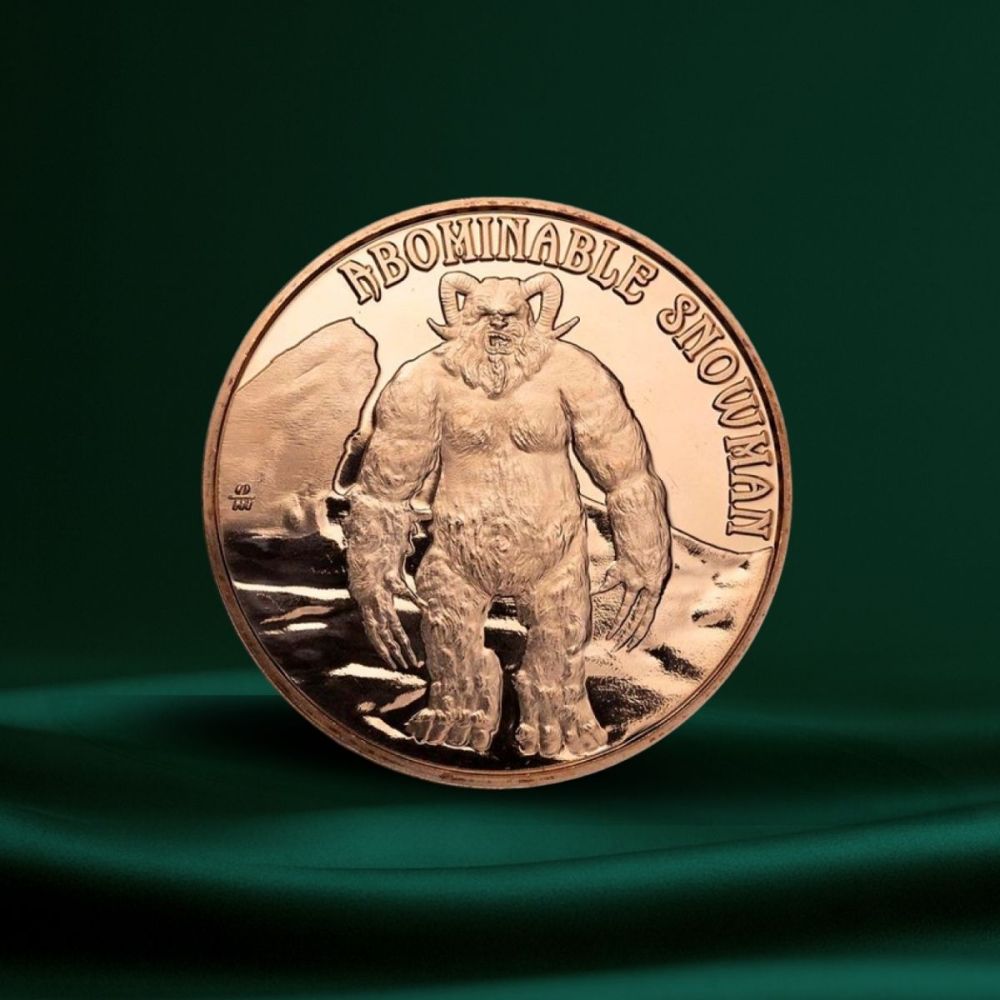 Denne kobbermynten viser den mystiske Abominable Snowman (Yeti) foran snødekte fjell. Kobber er et mykt metall, og mynten utforsker den spennende verdenen av kryptozoologi. Baksiden har et unikt design med kryptid-tema, noe som gjør den populær blant samlere. Selv om den bare veier 28,35 gram (1 unse), har den verdi både som samleobjekt og på grunn av kobberet. Mynten er laget av Golden State Mint.